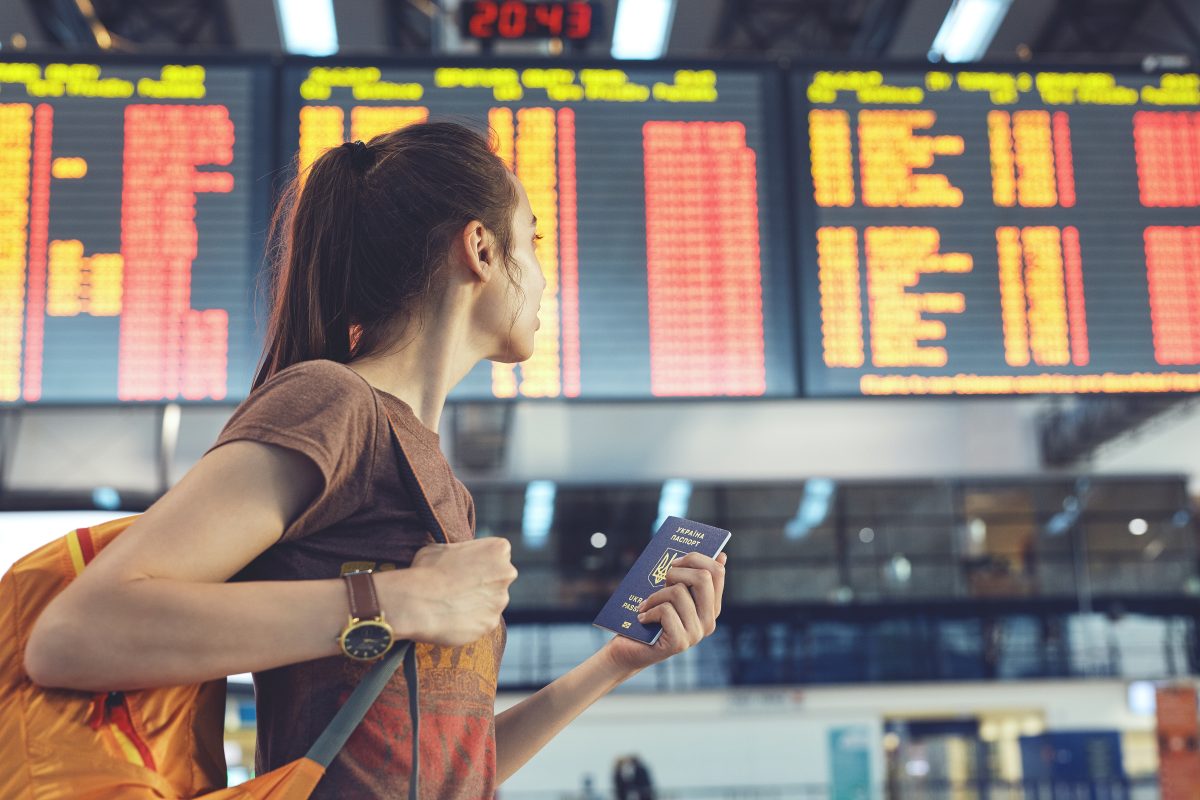 Young woman in international airport looking at the flight information board